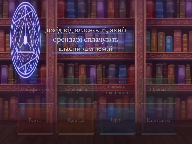 Рента - дохід від власності, який орендарі сплачують власникам землі, Оренда - найм майна, тимчасове користування ним за  певну плату, Капітал - гроші, які підприємці вкладали в  розвиток свого виробництва, Капіталізм - суспільно-економічний лад, за якого основні засоби виробництва перебували у  приватній власності підприємців, Біржа - місце, де  здійснюються різні торговельні та фінансові операції., Мануфактура - велике підприємство, на  якому використовувалися ручні знаряддя праці та існував поділ праці., Наймані працівники - особисто вільні робітники, які, не маючи інших засобів до існування, працювали на  власника, Буржуазія - суспільна верства, яка  в  період становлення капіталізму перетворилася на  панівну, що володіла основними засобами виробництва,