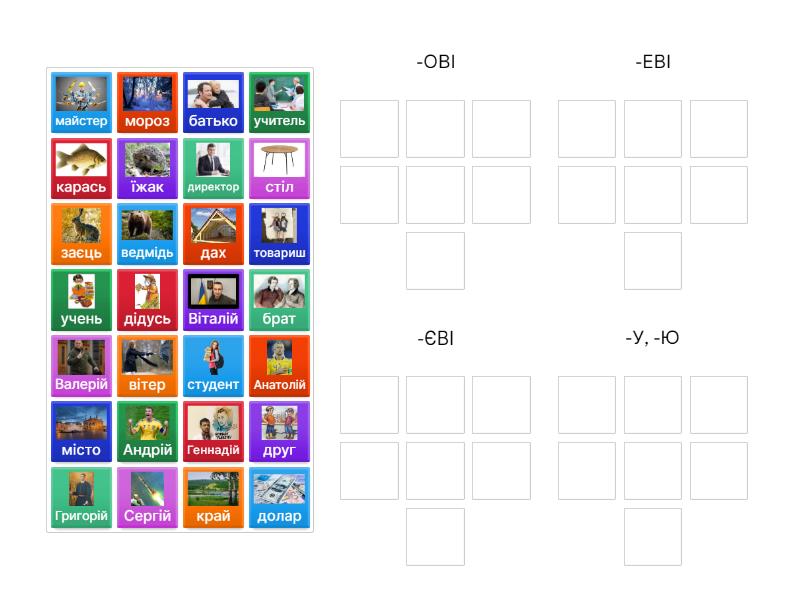 -ОВІ: брат , батько , студент , друг , директор, майстер, їжак, -ЕВІ: учитель , товариш, дідусь , учень , ведмідь , заєць , карась , -ЄВІ: Андрій , Віталій , Сергій , Валерій, Геннадій, Анатолій, Григорій, -У, -Ю: дах, місто, вітер, край, долар, мороз, стіл,