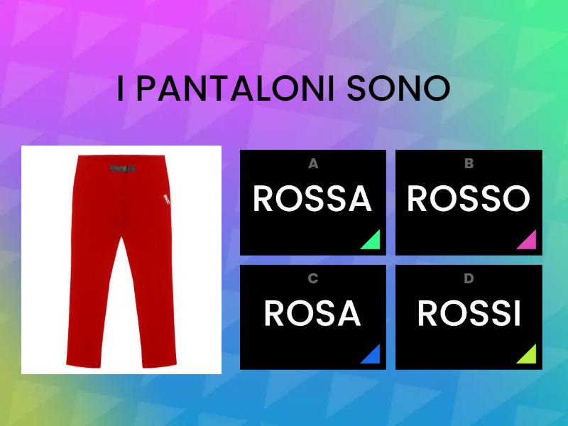 1) I PANTALONI SONO a) ROSSA b) ROSSO c) ROSA d) ROSSI 2) LE CALZE SONO a) GIALLA b) GIALLI c) GIALLE d) GIALLO 3) IL CAPPELLO E'  a) GRIGIO b) GRIGI c) GRIGE d) GRIGIA 4) LA GONNA E' a) NERO b) NERA c) NERE d) NERI 5) LE CAMICIE SONO a) AZZURRA b) AZZURRO c) AZZURRE d) AZZURRI 6) LA FELPA E' a) GRIGIO b) GRIGIE c) GRIGI d) GRIGIA 7) LA GIACCA E' a) ARGENTI b) ARGENTA c) ARGENTO d) ARGENTE 8) LE CRAVATTE SONO a) COLORATI b) COLORATA c) COLORATE d) COLORATO 9) LE SCARPE SONO a) BIANCO b) BIANCHE c) BIANCHI d) BIANCA 10) IL MAGLIONE E' a) VERDE b) VERDO c) VERDI d) VERDA 11) GLI STIVALI SONO a) MARRONI b) MARRONE c) MARONE d) MARRONO 12) I BLUE JEANS SONO a) AZZURRO b) AZZURRA c) AZZURRE d) AZZURRI 13) LA CRAVATTA E' a) ROSE b) ROSA c) ROSO d) ROSSA 14) IL PIGIAMA E' a) GRIGIE b) GRIGI c) GRIGIO d) GRIGIA 15) GLI OCCHIALI SONO a) BIANCO b) BANCHI c) BIANCHE d) BIANCHI
