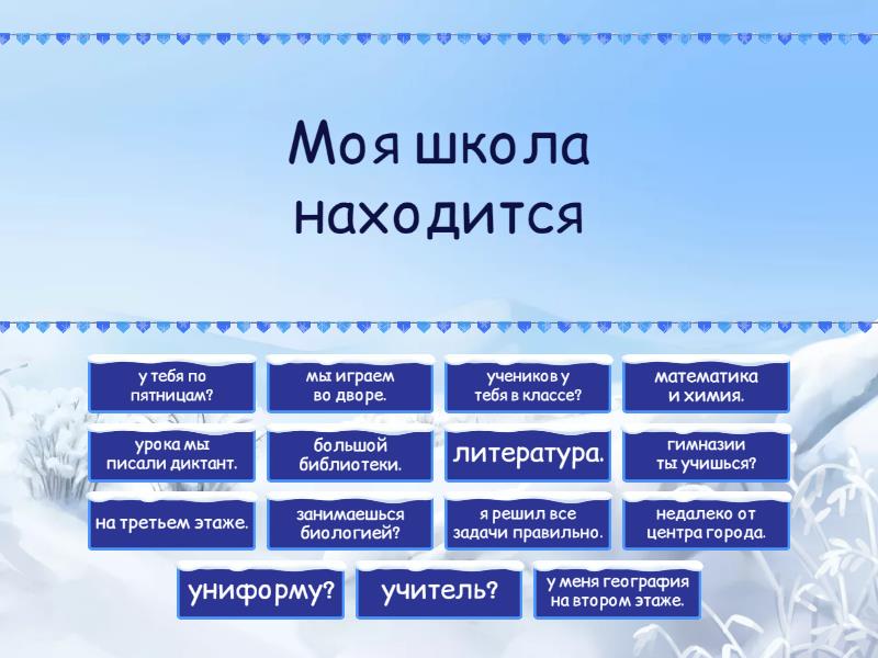 недалеко от центра города. - Моя школа находится , литература. - Мой любимый урок -, на третьем этаже. - Кабинет русского языка находится, математика и химия. - Мне не нравятся, у меня география на втором этаже. - По вторникам , я решил все задачи правильно. - На уроке математики, учитель? - Кто твой любимый, занимаешься биологией? - С кем ты, гимназии ты учишься? - В какой , у тебя по пятницам? - Какие уроки, мы играем во дворе. - На переменах, урока мы писали диктант. - В начале, униформу? - В вашей школе носят, большой библиотеки. - У нас в школе нет, учеников у тебя в классе? - Сколько ,