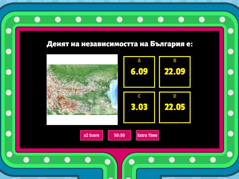 1) Денят на независимостта на България е: a) 6.09 b) 22.09 c) 3.03 d) 22.05 2) Какъв цвят на езика имат жирафите? a) жълт b) червен c) оранжев d) син 3) Кога е подписан фермана за учредяване на Българската екзархия? a) 27януари1870 b) 27февруари1870 c) 17 февруари1681 d) 18юни1870