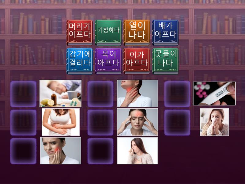 열이 나다, 이가 아프다 , 머리가 아프다 , 감기에 걸리다 , 콧물이 나다 , 배가 아프다, 기침하다 , 목이 아프다,