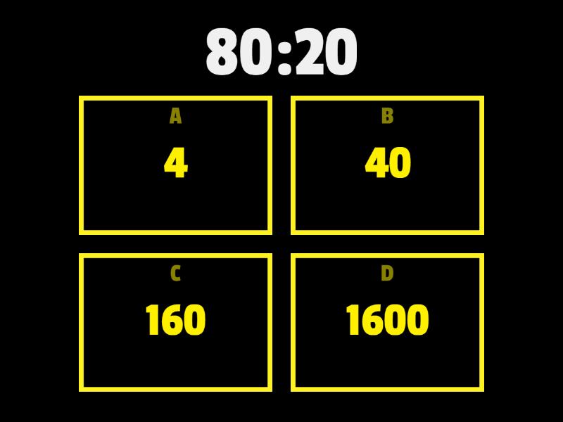 1) 80:20 a) 4 b) 40 c) 160 d) 1600 2) 100:50 a) 20 b) 2 c) 50 d) 500 3) 60:30 a) 12 b) 2 c) 20 d) 3 e) 30 4) 60:20 a) 20 b) 2 c) 3 d) 30 5) 80:80 a) 8 b) 1 c) 10 d) 100 6) 80:40 a) 4 b) 2 c) 3 d) 40 e) 14 f) 20 7) 100:20 a) 5 b) 50 c) 20 d) 2 8) 40:40 a) 1 b) 10 c) 4 d) 8 9) 40:10 a) 1 b) 10 c) 11 d) 4 e) 40
