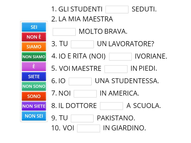 1. GLI STUDENTI ____ SEDUTI. 2. LA MIA MAESTRA ____ MOLTO BRAVA. 3. TU ____ UN LAVORATORE? 4. IO E RITA (NOI) ____ IVORIANE. 5. VOI MAESTRE ____ IN PIEDI. 6. IO ____ UNA STUDENTESSA. 7. NOI ____ IN AMERICA. 8. IL DOTTORE ____ A SCUOLA. 9. TU ____ PAKISTANO. 10. VOI ____ IN GIARDINO.