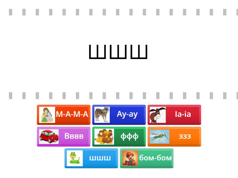 шшш - ШШШ, Іа-іа - Іа-іа, ззз - ЗЗЗ, ффф - ФФФ, Вввв - Вввв, Ау-ау - Ау-ау, бом-бом - бом-бом, М-А-М-А - м-а-м-а,