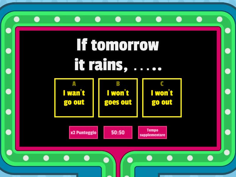 1) If tomorrow it rains, ….. a) I wan’t go out b) I won’t goes out c) I won’t go out 2) If your friend calls us, …… a) Will we go out with him? b) We go will out with him c) we will go out with him? 3) If I didn’t have a brother,…… a) I would go at holiday alone b) I would go on holiday alone 4) If she walks,…. a) I will happy b) I will be happy 5) If I get a cold, it will be your fault! a) first conditional b) second conditional 6) I will be mad…. a) Sara is late again b) If Sara is late again c) If Sara are late again 7) If you don't hurry,…….. a) If you will miss the bus b) You would miss the bus c) You will miss the bus 8) If I went to the Moon, I would be happy a) First conditional b) second conditional 9) If you were millionaire,…… a) What will you buy? b) What will not you buy? c) what would you buy? 10) If she fell,……… a) she would hurt herself b) she won’t hurt herself c) she hurt ourself would