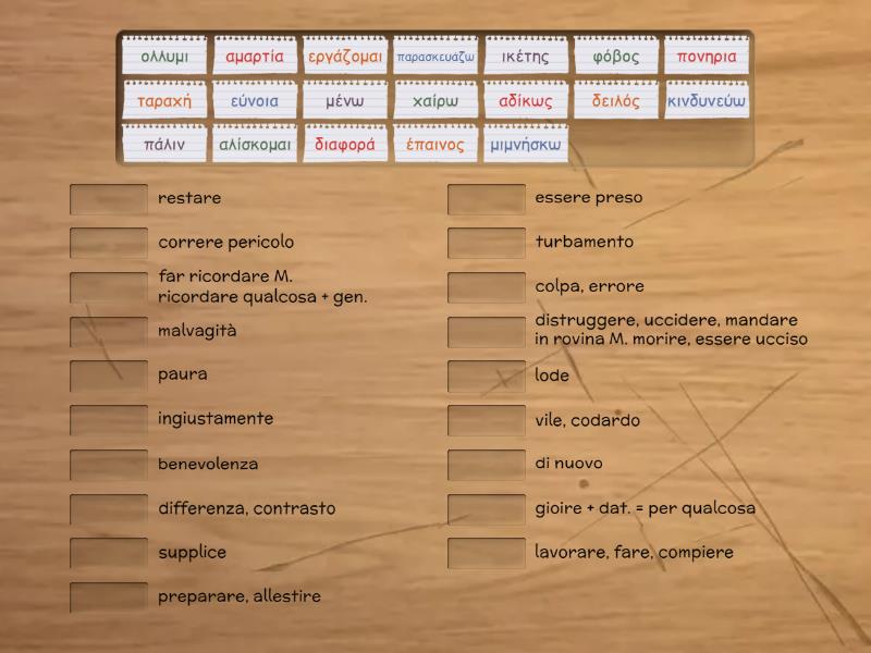 αμαρτία - colpa, errore , ικέτης - supplice, πονηρια - malvagità , δειλός - vile, codardo, αδίκως - ingiustamente, πάλιν - di nuovo, εργάζομαι - lavorare, fare, compiere, μένω - restare, ολλυμι - distruggere, uccidere, mandare in rovina M. morire, essere ucciso, διαφορά - differenza, contrasto, έπαινος - lode, εύνοια - benevolenza, ταραχή - turbamento, φόβος - paura, αλίσκομαι - essere preso, κινδυνεύω - correre pericolo, μιμνήσκω - far ricordare M. ricordare qualcosa + gen. , παρασκευάζω - preparare, allestire, χαίρω - gioire + dat. = per qualcosa ,