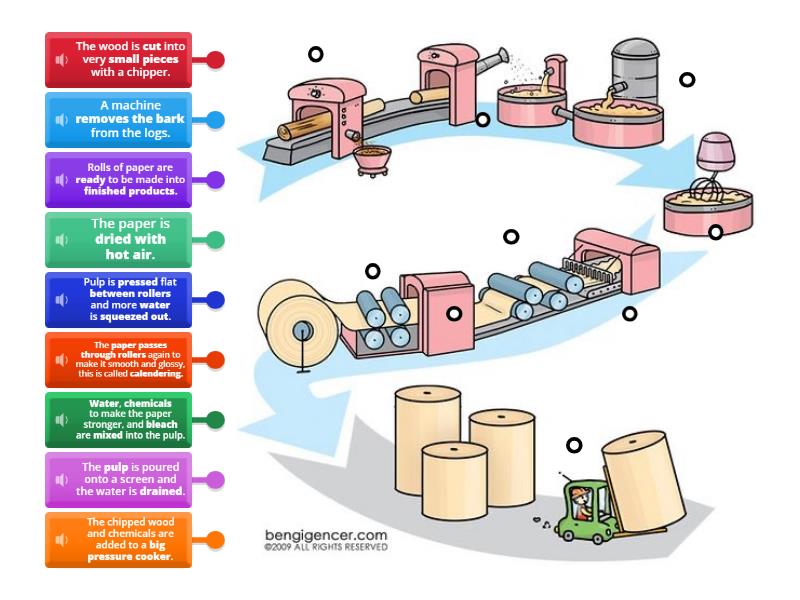 A machine removes the bark from the logs., The wood is cut into very small pieces with a chipper., The chipped wood and chemicals are added to a big pressure cooker., Water, chemicals to make the paper stronger, and bleach are mixed into the pulp., The pulp is poured onto a screen and the water is drained., Pulp is pressed flat between rollers and more water is squeezed out., The paper is dried with hot air., The paper passes through rollers again to make it smooth and glossy, this is called calendering., Rolls of paper are ready to be made into finished products. .
