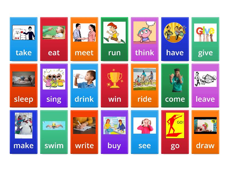 go - went, have - had, see - saw, make - made, write - wrote, buy - bought, eat - ate, sing - sang, come - came, ride - rode, give - gave, drink - drank, draw - drew, take - took, win - won, sleep - slept, think - thought, run - ran, swim - swam, meet - met, leave - left,