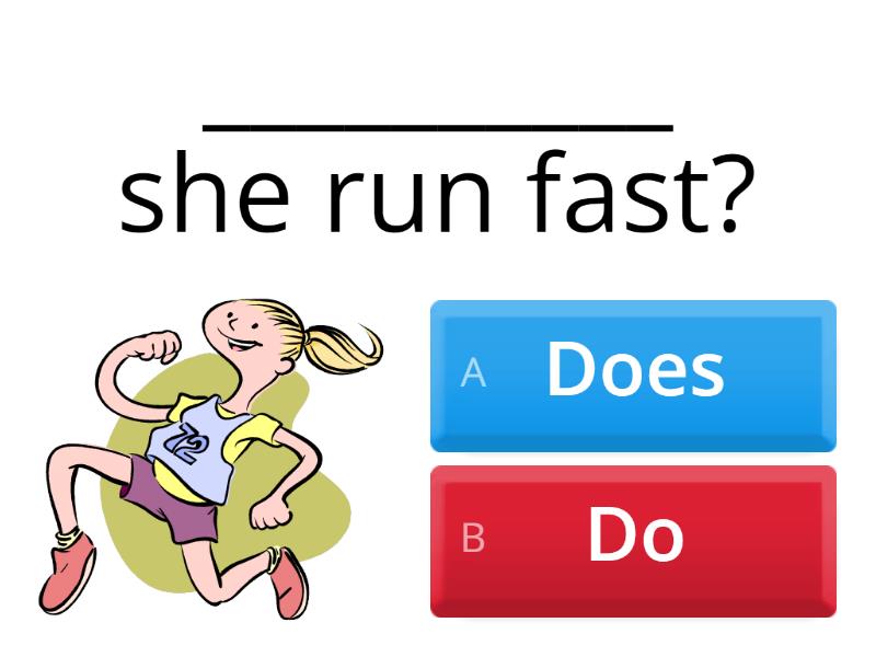 1) __________ she run fast?  a) Does b) Do 2) __________ we go to school at 8 am? a) Does b) Do 3) ___________ they play soccer? a) Does b) Do 4) __________ they go to bed early? a) Does b) Do 5) __________ you go to dance classes? a) Do b) Does 6) __________ you play video games?  a) Do b) Does 7) __________ she collect badges?  a) Does b) Do 8) ___________ he play volleyball? a) Do b) Does 9) ___________ she play the piano? a) Do b) Does 10) ___________ we study a foreign language? a) Do b) Does 11) ___________he swim on Saturday? a) Does b) Do 12) ___________we ride a bike? a) Does b) Do
