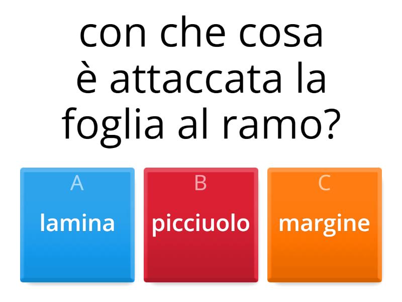 1) con che cosa è attaccata la foglia al ramo? a) lamina b) picciuolo c) margine 2) Cos' è seghettato nella foglia? a) margine b) lamina c) picciuolo 3) Come si chiama la parte superiore della foglia a) margine b) picciuolo c) lamina 4) Come si chiama il gambo del fiore ? a) stelo b) stami c) pistilli 5) Come si chiama la parte colorata del fiore? a) stami b) petalo c) pistillo