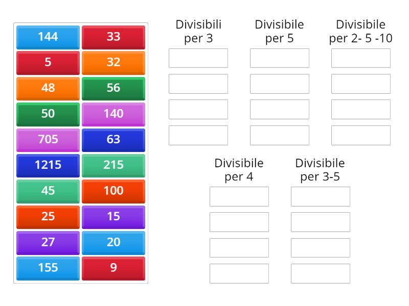 Divisibili per 3: 63, 27, 33, 9, Divisibile per 5: 25, 5, 215, 155, Divisibile per 2- 5 -10: 100, 20, 50, 140, Divisibile per 4: 32, 144, 48, 56, Divisibile per 3-5: 15, 45, 1215, 705,