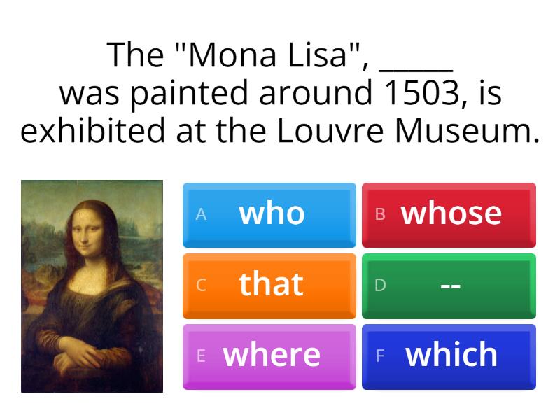 1) The "Mona Lisa", _____ was painted around 1503, is exhibited at the Louvre Museum. a) who b) whose c) that d) -- e) where f) which 2) Italy is a country _____ beauty and culture attract many tourists. a) who b) whose c) that d) whom e) where f) which 3) Lucio Battisti, ___ was an important Italian singer, died in 1998 in Milan. a) who b) whose c) that d) -- e) when f) which 4) This is the street artist _____ we saw 3 years ago in Duluth. a) who b) whose c) that d) -- e) whum f) which 5) Those rich people, _____ boat capsized offshore, were rescued by helicopter. a) who b) where c) -- d) that e) whose f) which 6) This is the program_____ I downloaded yesterday. It's great. a) who b) where c) -- d) that e) whom f) which 7) The Police have just found the building _____ the robbers were hiding. a) when b) which c) whose d) where e) who f) how 8) Have you received the carrots _____ you ordered a week ago? a) when b) which c) whose d) where e) -- f) that 9) The lawyer said: "Mr. Trent, ____ I defend and represent, is clearly innocent."  a) which b) that c) whom d) who e) whose f) whum 10) My Nigerian friend, ___ I went to the North Pole with, is leaving for Antartica. a) which b) that c) with d) who e) whose f) whum