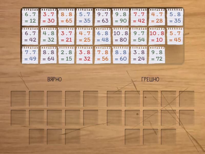ВЯРНО: 4 . 8 = 32, 8 . 8 = 64, 5 . 7 = 35, 6 . 8 = 48, 3 . 7 = 21, 7 . 8 = 56, 7 . 7 = 49, 9 . 7 = 63, 9 . 8 = 72, 4 . 7 = 28, 10 . 8 = 80, 6 . 7 = 42, 3 . 8 = 24, ГРЕШНО: 2 . 8 = 15, 8 . 8 = 65, 5 . 8 = 35, 7 . 7 = 42, 8 . 8 = 60, 3 . 8 = 32, 5 . 7 = 45, 4 . 7 = 25, 3 . 7 = 30, 9 . 8 = 90 , 6 . 7 = 12, 10 . 8 = 10, 9 . 7 = 54 ,