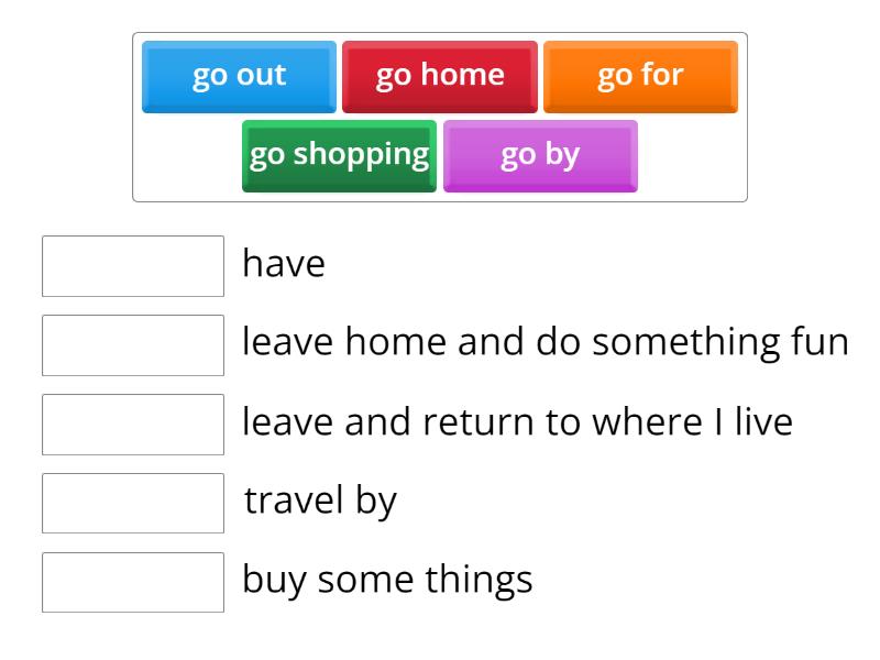 go home - leave and return to where I live, go by - travel by, go shopping - buy some things, go for - have, go out - leave home and do something fun,