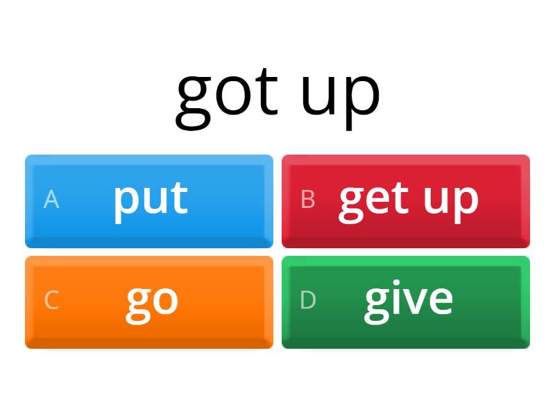 1) got up a) put b) get up c) go d) give 2) put a) get up b) give c) put d) take 3) had a) have b) get up c) come d) can 4) saw a) see b) do c) eat d) take 5) said a) do b) drink c) get up d) say 6) gave a) go b) give c) have d) drink 7) came a) come b) do c) take d) say 8) went a) eat b) have c) drink d) go 9) took a) take b) have c) put d) can 10) did a) have b) do c) say d) go 11) could a) can b) come c) take d) give 12) ate a) say b) eat c) come d) give 13) drank a) take b) drink c) get up d) say