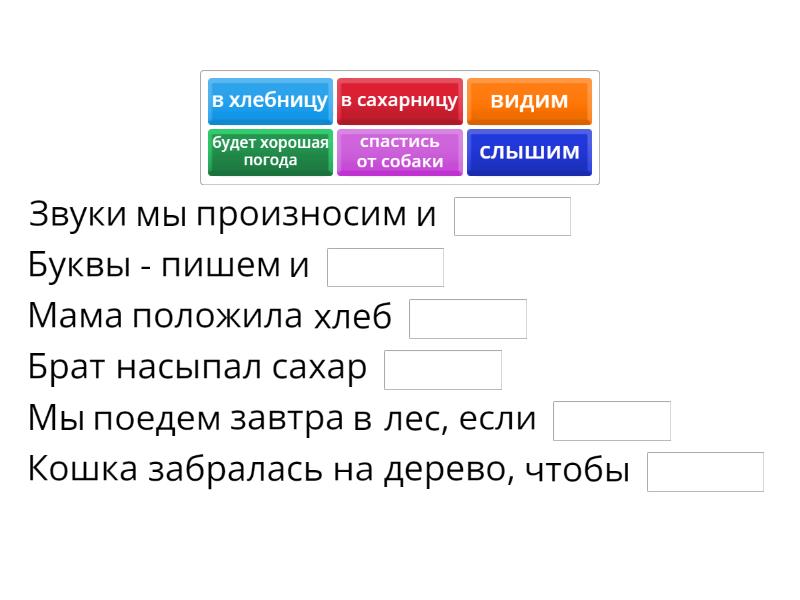 Звуки мы произносим и ____ Буквы - пишем и ____ Мама положила хлеб ____ Брат насыпал сахар ____ Мы поедем завтра в лес, если ____ Кошка забралась на дерево, чтобы ____