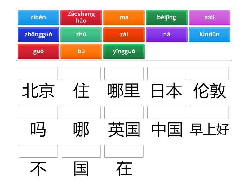 Zǎoshang hǎo - 早上好, zhōngguó - 中国, rìběn - 日本, guó - 国, ma - 吗, bù - 不, nǎlǐ - 哪里, nǎ - 哪, yīngguó - 英国, zhù - 住, zài - 在, lúndūn - 伦敦, běijīng - 北京,