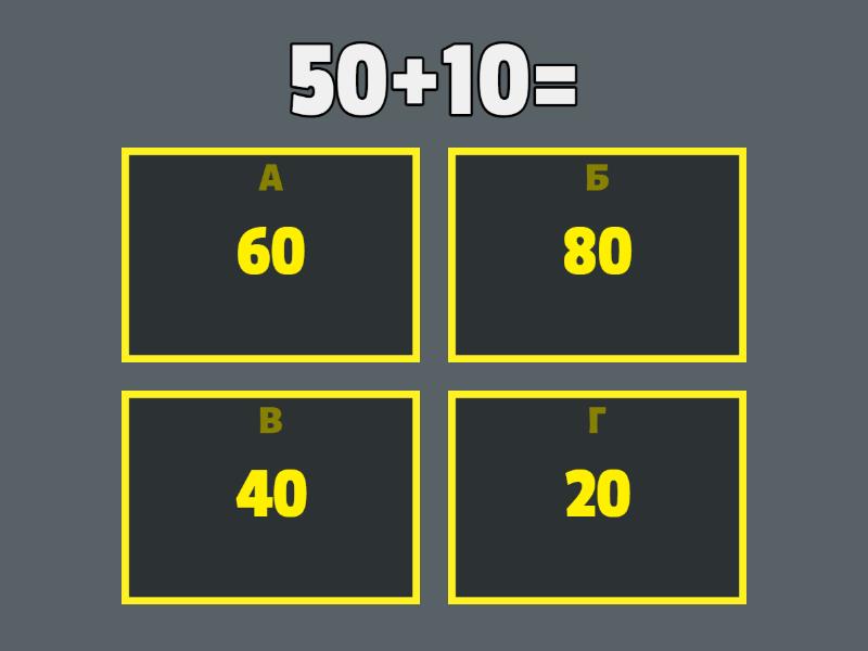 1) 50+10= a) 40 b) 20 c) 80 d) 60 2) Мама испекла 10 пирожков, а булочек – на 2 меньше. Сколько булочек испекла мама? a) 11 b) 8 c) 17 3) 100-40= a) 50 b) 60 c) 70 4) Альбом стоит 60 тенге, а краски на 30 тенге дороже. Сколько стоят краски? a) 90 b) 20 c) 100 d) 70 5) 9+7= a) 18 b) 16 c) 20 6) 19-___=9 a) 8 b) 10 c) 9 7) 20-10= a) 10 b) 30 c) 0 8) 18-8= a) 8 b) 10 c) 5 9) 10+10+10+5= a) 35 b) 45 c) 55 10) 10+20+20+20= a) 50 b) 100 c) 70 11) 100-80= a) 10 b) 5 c) 15 d) 20 12) 40+5+5= a) 55 b) 25 c) 80 d) 50