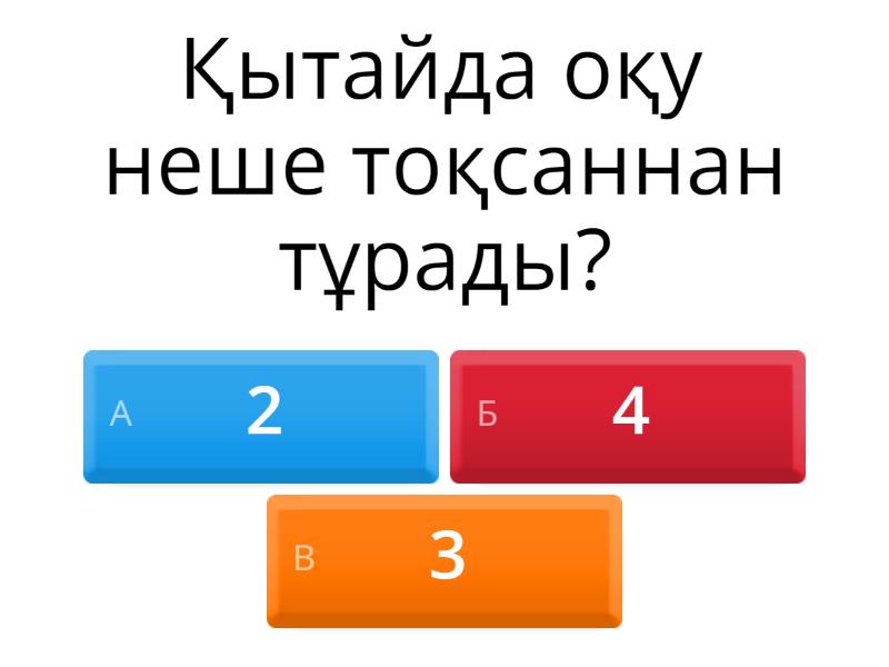 1) Қытайда оқу неше тоқсаннан тұрады? a) 2 b) 4 c) 3 2) Қытайда балалар қай сыныптан бастап ағылшын тілін оқиды? a) 3 b) 4 c) 2 3) Сабақтан тыс дене шынықтыру сабақтары аптасына қанша минуттан асады. a) 45 b) 40 c) 70 4) сабақ қанша минутка созылады? a) 40 b) 60 c) 45 5) сабақ қаншада басталады ? a) 7:30 b) 8:30 c) 8:00 6) бір сыныпта қанша бала оқуы мүмкін a) 30-40 b) 25-28 c) 20 7) Университетте бакалавр деңгейін неше жылда алады? a) 6-9 b) 4-5 c) 5-8 8) Қытай мектептерінде оқу жылы неше жылға созылады? a) 12 b) 11 c) 10 9) Қытай мектептерінде оқыту жүйесі неше кезеңнен тұрады? a) 4 b) 3 c) 5