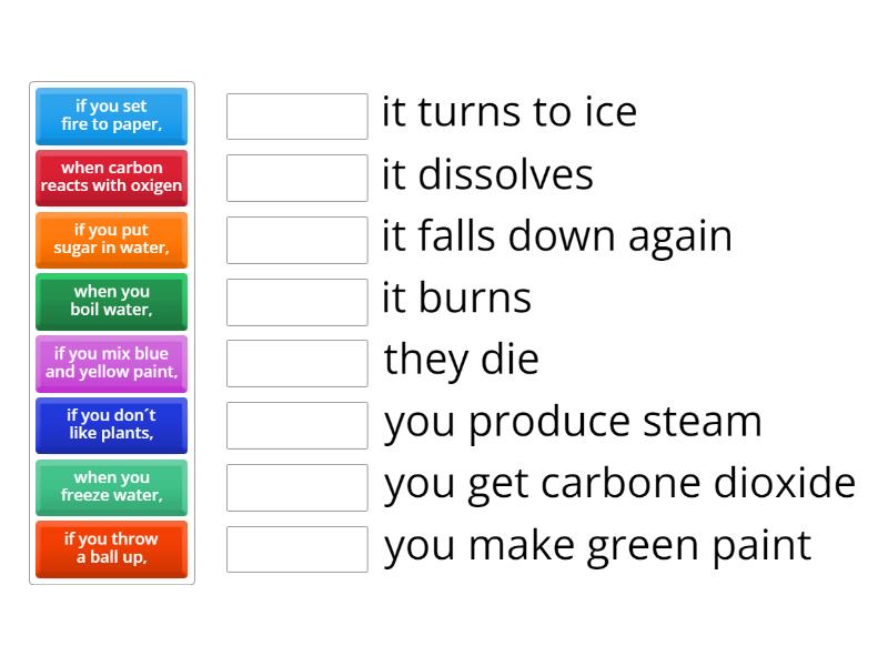 when carbon reacts with oxigen - you get carbone dioxide, if you throw a ball up, - it falls down again, if you mix blue and yellow paint, - you make green paint, when you freeze water, - it turns to ice, if you put sugar in water, - it dissolves, if you set fire to paper, - it burns, if you don´t like plants, - they die, when you boil water, - you produce steam,