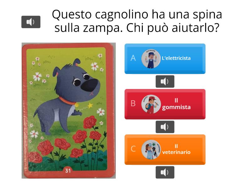 1) Questo cagnolino ha una spina sulla zampa. Chi può aiutarlo? a) L'elettricista b) Il gommista c) Il veterinario 2) Bravo! Ora il cagnolino può continuare a correre sul prato. Scegli un premio a) b) c) 3) Povero cucciolo. Sta piovendo e si sta bagnando tutto! Come possiamo aiutarlo? a) Usando il salvagente b) Dandogli il biberon c) Riparandolo con un ombrello 4) Bravo! Ora il cucciolo resterà all'asciutto! Scegli un premio. a) b) c)