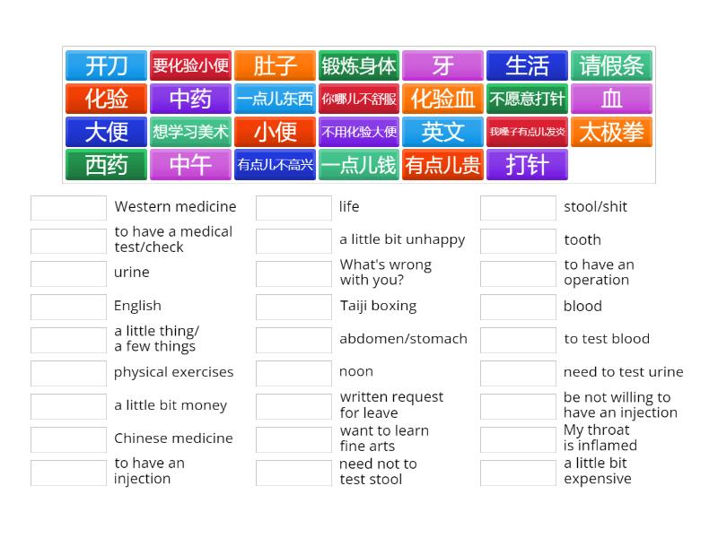 英文 - English , 开刀 - to have an operation, 化验 - to have a medical test/check, 血 - blood, 大便 - stool/shit, 小便 - urine, 牙 - tooth, 肚子 - abdomen/stomach, 生活 - life, 中午 - noon, 打针 - to have an injection, 太极拳 - Taiji boxing, 请假条 - written request for leave, 你哪儿不舒服 - What's wrong with you?, 有点儿贵 - a little bit expensive, 有点儿不高兴 - a little bit unhappy, 一点儿东西 - a little thing/ a few things, 一点儿钱 - a little bit money, 化验血 - to test blood, 要化验小便 - need to test urine, 不用化验大便 - need not to test stool, 锻炼身体 - physical exercises , 不愿意打针 - be not willing to have an injection, 中药 - Chinese medicine, 西药 - Western medicine, 想学习美术 - want to learn fine arts, 我嗓子有点儿发炎 - My throat is inflamed,