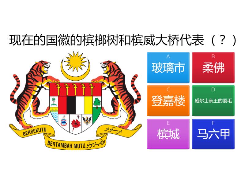 1) 国徽上的四色代表? a) 马来联邦 b) 马来属邦 c) 海峡殖民地 d) 沙巴 e) 砂拉越 2) 国徽上的四色代表? a) 霹雳 b) 彭亨 c) 雪兰莪 d) 森美兰 e) 砂拉越 f) 沙巴 3) 这是哪一年的国徽? a) 1896 b) 1948 c) 1963 d) 1965 e) 现在的国徽 4) 这是哪一年的国徽? a) 1896 b) 1948 c) 1963 d) 1965 e) 现在的国徽 5) 1963年国徽上的新月代表( ?) a) 伊斯兰教 b) 回教 c) 兴都教 d) 佛教 6) 这是哪一年的国徽? a) 1896 b) 1948 c) 1963 d) 1965 e) 现在的国徽 7) 1965年国徽为什么过了2年就要改? a) 因为不美 b) 因为新加坡退出马来西亚 c) 因为沙巴退出马来西亚 d) 因为喜欢 8) 1965年国徽和1963年国徽有什么不一样 a) 原本新加坡的图变成大红花 b) 看不出来 c) 老虎的舌头更长了 9) 这是哪一年的国徽? a) 1896 b) 1948 c) 1963 d) 1965 e) 现在的国徽 10) 这是哪一年的国徽? a) 1896 b) 1948 c) 1963 d) 1965 e) 现在的国徽 11) 1948年国徽共有多少角星? a) 11 b) 14 c) 9 d) 13 12) 现在的国徽共有多少角星? a) 11 b) 14 c) 9 d) 13 13) 1963年国徽共有多少角星? a) 11 b) 14 c) 9 d) 13 14) 1948年国徽的角星代表( ?) a) 11州 b) 14州 c) 10州和联邦直辖区 d) 13州和联邦直辖区 15) 现在的国徽的角星代表( ?) a) 11州 b) 14州 c) 10州和联邦直辖区 d) 13州和联邦直辖区 16) 1963年国徽的角星代表( ?) a) 11州 b) 14州 c) 10州和联邦直辖区 d) 13州和联邦直辖区 17) 1948年国徽的新月代表( ?) a) 伊斯兰教 b) 回教 c) 基督教 d) 佛教 e) 兴都教 18) 现在的国徽的新月代表( ?) a) 伊斯兰教 b) 回教 c) 基督教 d) 佛教 e) 兴都教 19) 1948年国徽的5把短剑代表( ?) a) 马来联邦 b) 马来属邦 c) 马来海峡 d) 马来亚 e) 海峡殖民地 20) 现在的国徽的5把短剑代表( ?) a) 马来联邦 b) 马来属邦 c) 马来海峡 d) 马来亚 e) 海峡殖民地 21) 1963年国徽的5把短剑代表( ?) a) 马来联邦 b) 马来属邦 c) 马来海峡 d) 马来亚 e) 海峡殖民地 22) 1948年国徽的5把短剑代表( ?) a) 吉打 b) 吉兰丹 c) 登嘉楼 d) 柔佛 e) 玻璃市 f) 槟城 23) 现在的国徽的5把短剑代表( ?) a) 吉打 b) 吉兰丹 c) 登嘉楼 d) 柔佛 e) 玻璃市 f) 槟城 24) 现在的国徽的红黑白黄代表( ?) a) 霹雳 b) 森美兰 c) 彭亨 d) 雪兰莪 e) 玻璃市 f) 槟城 25) 1963年国徽的红黑白黄代表( ?) a) 霹雳 b) 森美兰 c) 彭亨 d) 雪兰莪 e) 玻璃市 f) 槟城 26) 1965年国徽的红黑白黄代表( ?) a) 霹雳 b) 森美兰 c) 彭亨 d) 雪兰莪 e) 玻璃市 f) 槟城 27) 1948年国徽的红黑白黄代表( ?) a) 霹雳 b) 森美兰 c) 彭亨 d) 雪兰莪 e) 玻璃市 f) 槟城 28) 现在的国徽的红黑白黄代表( ?) a) 马来联邦 b) 马来属邦 c) 海峡殖民地 d) 马来亚 e) 马来西亚 f) 槟城 29) 1963年国徽的红黑白黄代表( ?) a) 马来联邦 b) 马来属邦 c) 海峡殖民地 d) 马来亚 e) 马来西亚 f) 槟城 30) 1965年国徽的红黑白黄代表( ?) a) 马来联邦 b) 马来属邦 c) 海峡殖民地 d) 马来亚 e) 马来西亚 f) 槟城 31) 1948年国徽的红黑白黄代表( ?) a) 马来联邦 b) 马来属邦 c) 海峡殖民地 d) 马来亚 e) 马来西亚 f) 槟城 32) 1963年国徽的5把短剑代表( ?) a) 吉打 b) 吉兰丹 c) 登嘉楼 d) 柔佛 e) 玻璃市 f) 槟城 33) 1948年国徽的红色建筑物代表( ?) a) A'Famosa b) 马六甲 c) 登嘉楼 d) 柔佛 e) 玻璃市 f) 槟城 34) 1963年国徽的绿色树代表( ?) a) 马六甲树 b) 马六甲 c) 登嘉楼 d) 柔佛 e) 玻璃市 f) 槟城 35) 现在的国徽的绿色树代表( ?) a) 马六甲树 b) 马六甲 c) 登嘉楼 d) 柔佛 e) 玻璃市 f) 槟城 36) 1948年国徽的白色羽毛代表( ?) a) 威尔士亲王的羽毛 b) 马六甲 c) 登嘉楼 d) 柔佛 e) 玻璃市 f) 槟城 37) 现在的国徽的槟榔树和槟威大桥代表( ?) a) 威尔士亲王的羽毛 b) 马六甲 c) 登嘉楼 d) 柔佛 e) 玻璃市 f) 槟城 38) 现在的国徽上的槟城有什么标志 a) 槟威大桥 b) 马六甲树 c) 登嘉楼 d) 柔佛 e) 玻璃市 f) 槟榔树 39) 1963年国徽的白色羽毛代表( ?) a) 威尔士亲王的羽毛 b) 马六甲 c) 登嘉楼 d) 柔佛 e) 玻璃市 f) 槟城 40) 1948年国徽盾牌两侧的老虎代表( ?) a) 勇敢 b) 努力 c) 团结 d) 害羞 e) 害怕 f) 用心 41) 现在的国徽盾牌两侧的老虎代表( ?) a) 勇敢 b) 努力 c) 团结 d) 害羞 e) 害怕 f) 用心 42) 现在的国徽上的大红花代表( ?) a) 勇敢 b) 国花 c) 团结 d) 害羞 e) 害怕 f) 用心 43) 1965年国徽上的大红花代表( ?) a) 勇敢 b) 国花 c) 团结 d) 害羞 e) 害怕 f) 用心 44) 1963年国徽盾牌两侧的老虎代表( ?) a) 勇敢 b) 努力 c) 团结 d) 害羞 e) 害怕 f) 用心 45) 1948年国徽下方黄色横条上的英文字代表( ?) a) 团结就是力量 b) Unity is strength c) 力量 d) 团结 e) 勇敢 f) 回教 46) 1963年国徽下方黄色横条上的国文字代表( ?) a) 团结就是力量 b) Bersekutu Bertambah Mutu c) 力量 d) 团结 e) 勇敢 f) 回教 47) 现在的国徽下方黄色横条上的国文字代表( ?) a) 团结就是力量 b) Bersekutu Bertambah Mutu c) 力量 d) 团结 e) 勇敢 f) 回教 48) 1948年国徽下方黄色横条上为什么是英文字 a) 因为这个时候还是英国统治 b) 因为这个时候还是日本统治 c) 因为这个时候喜欢英文 49) 1963年国徽下方黄色横条上为什么从英文字变成国文字 a) 因为这个时候还是英国统治 b) 因为这个时候还是日本统治 c) 因为这个时候喜欢国文 d) 因为这时候马来西亚正式成立 e) 这时候没有英国统治了 50) 1963年国徽下方多了3个方块代表( ?) a) 新加坡 b) 沙巴 c) 砂拉越 d) 柔佛 e) 吉打