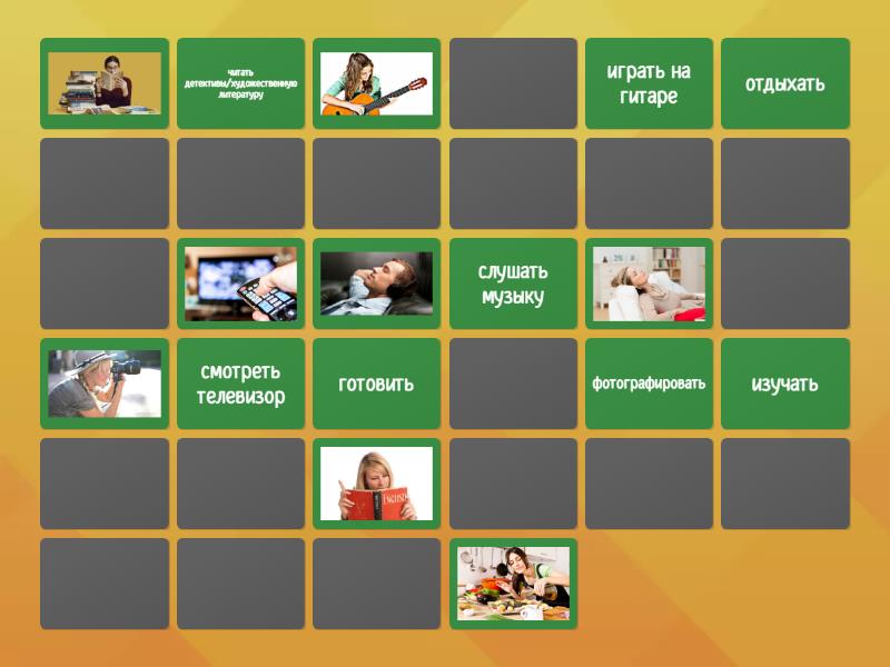 изучать, играть на гитаре, фотографировать, слушать музыку, отдыхать, читать детективы/художественную литературу, готовить, смотреть телевизор, играть в гольф, рисовать, ходить в кино, спать, играть в настольные игры, кушать, гулять, плавать, заниматься спортом,