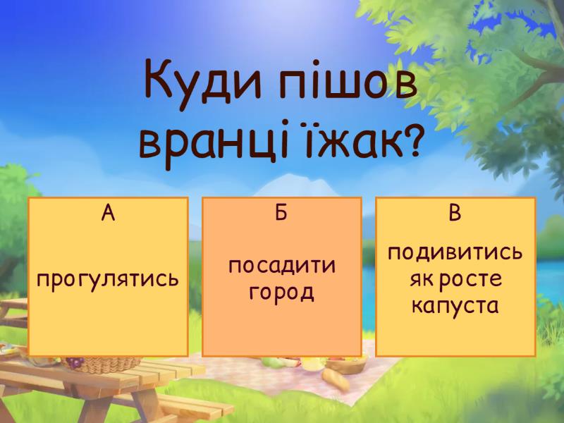 1) Куди пішов вранці їжак? a) прогулятись b) посадити город c) подивитись як росте капуста 2) Як заєць назвав їжака? a) колючка b) нероба c) криволапко 3) Хто запропонував змагатися у бігу наввипередки? a) заєць b) їжак c) обидва 4) Кого їжак попросив про допомогу? a) ведмедя b) вовка c) їжачиху 5) Скільки разів пробіг заєць? a) 100 b) 9 c) 99 6) Що по закінченню змагання їжак сказав зайцеві? a) Хто сміється, тому не минеться. b) Ніколи не треба сміятися зі слабшого. c) Сміх продовжує життя.