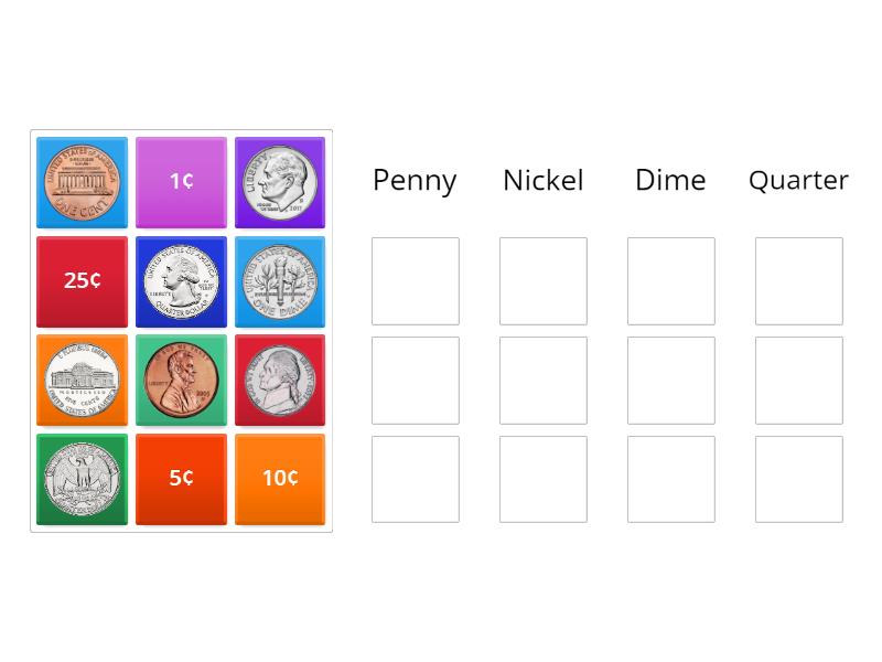 Penny: , , 1¢, Nickel: , , 5¢, Dime: , , 10¢, Quarter: , , 25¢,