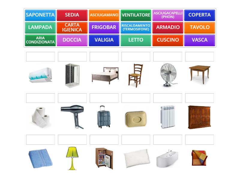 CUSCINO, LETTO, TAVOLO, VALIGIA, SAPONETTA, CARTA IGIENICA, COPERTA, SEDIA, ARMADIO, LAMPADA, ASCIUGACAPELLI (PHON), ASCIUGAMANO, ARIA CONDIZIONATA, DOCCIA, VASCA, FRIGOBAR, RISCALDAMENTO (TERMOSIFONE), VENTILATORE,