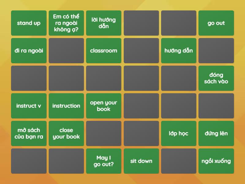 classroom  - lớp học , instruct v - hướng dẫn , instruction  - lời hướng dẫn , sit down - ngồi xuống , stand up - đứng lên , open your book - mở sách của bạn ra , close your book - đóng sách vào , go out  - đi ra ngoài , May I go out? - Em có thể ra ngoài không ạ?, come in - đi vào trong , May I come in? - Em có thể vào trong không?, speak - nói , speaker  - người nói , speak English - Nói tiếng Anh , Speak louder  - nói to lên , Speak Vietnamese - Nói tiếng Việt , study - học (nghiên cứu), learn - học (thực tế, thực hành),