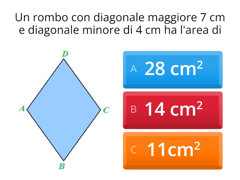 1) Area del quadrato a) L x 4 b) L x L c) L x 2 2) Area del rettangolo a) b x h b) L x 2 c) b + h 3) Base del rettangolo a) A x h b) A : h c) h : 2 4) Area del parallelogramma a) b+h b) b x L c) b x h 5) Altezza del parallelogramma a) b : 2 b) b + h c) A : b 6) Area del rombo a) (Dxd) : 2 b) (d+D) : 2 c) L x 4 7) Area del trapezio a) (B+b) x h : 2 b) (B x b) : 2 c) (B x b) x h : 2 8) Diagonale minore del rombo (d) a) (A x 2) : L b) (A x2) : d c) (Ax2) : D 9) Un quadrato con lato 5 cm ha l 'area di..  a) 25 cm2 b) 20 cm2 c) 25 cm 10) Un quadrato con l'area di 9 cm2 ha il lato di a) non si può calcolare b) 4,5 cm c) 3 cm 11) Un rettangolo con base di 7 cm e altezza di 3 ha l 'area di a) 10 cm2 b) 21cm2 c) 20 cm2 12) Un rettangolo con base di 8,5 cm e altezza di 10 cm ha l'area di  a) 85 cm2 b) 850 cm2 c) 85 cm 13) Un parallelogramma con base di 9 cm e altezza di 4 cm ha l 'area di  a) 36 cm b) 18 cm2 c) 36 cm2 14) Un rettangolo con area di 20 cm2 e altezza di 4 cm ha la base di  a) 24 cm b) 5 cm c) 5 cm2 15) Un rombo con diagonale maggiore 7 cm e diagonale minore di 4 cm ha l'area di  a) 28 cm2 b) 14 cm2 c) 11cm2 16) Un rombo con Area di 70 cm2 e diagonale minore di 10 cm, ha la diagonale maggiore di  a) 14 cm2 b) 140 cm c) 14 cm