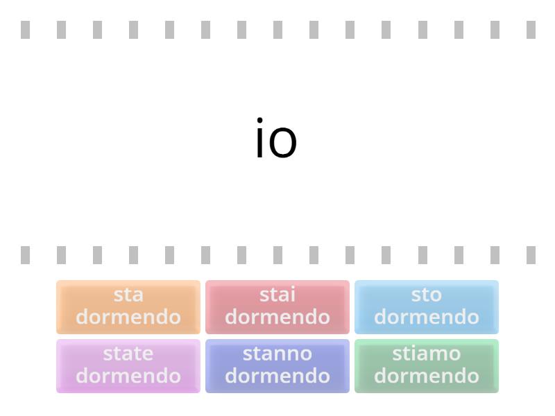 sto dormendo - io, stai dormendo - tu, sta dormendo - lui/lei/Lei, stiamo dormendo - noi, state dormendo - voi, stanno dormendo - loro,