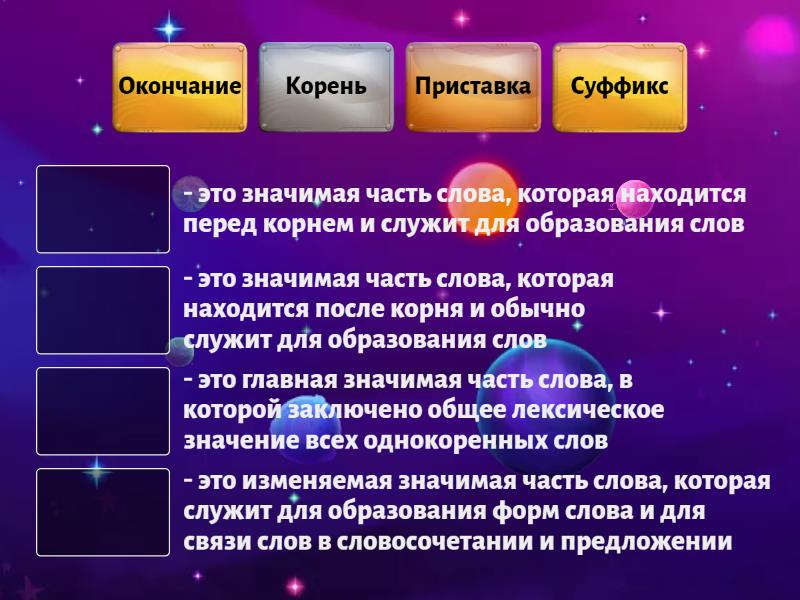 Окончание - - это изменяемая значимая часть слова, которая служит для образования форм слова и для связи слов в словосочетании и предложении, Корень - - это главная значимая часть слова, в которой заключено общее лексическое значение всех однокоренных слов, Суффикс - - это значимая часть слова, которая находится после корня и обычно служит для образования слов, Приставка - - это значимая часть слова, которая находится перед корнем и служит для образования слов,