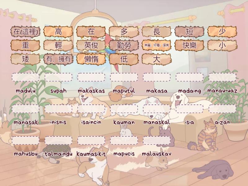 大 - madaing , 小 - kaumasikit, 多 - supah , 少 - kauman , 重 - mahusbu , 輕 - manasak , 長 - madulu , 短 - maputul , 高 - malauskav, 矮 - mapucis , 低 - inisnis , 美麗;好看;漂亮 - manau-uaz, 英俊 - talmaindu , 快樂 - manaskal , 勤勞 - makaskas , 懶惰 - makasa , 在(這裡) - isaincin, 在 - isia , 有;擁有 - aizan ,