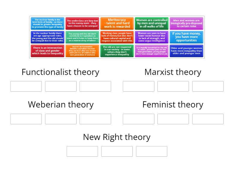 Functionalist theory: Meritocracy - talent and hard work is rewarded, Men and women are biologically pre-disposed to certain roles, It is mutally beneficial for the old to retire...provides jobs for the next generation, young people don't have enough experience yet, Marxist theory: women as housewives benefits capitalism because they can look after the worker and have lots of children (the next generation of workers), The young and the old don't contribute to Capitalism as much and it helps to keep them as a reserve army of labour, If you have money, you have more opportunities, Weberian theory: Women are seen to have lower social honour due to lack of strength, and some argue intelligence, The old are not respected in our society - in some others they don't experience inequality, Working class people have lack of money but also don't have cultural capital and respect associated with this, Feminist theory: Women are controlled by men and unequal in all walks of life, Older and younger women have more inequality than older and younger men, There is an intersection of class and gender which leads to inequality, New Right theory: The nuclear family is the best form of family - so there should be gender inequality to promote this type of family, The underclass are lazy due to the nanny state - they have chosen to be unequal, In the nuclear family there are age approproate roles, the young and the old should be unequal due to their roles,