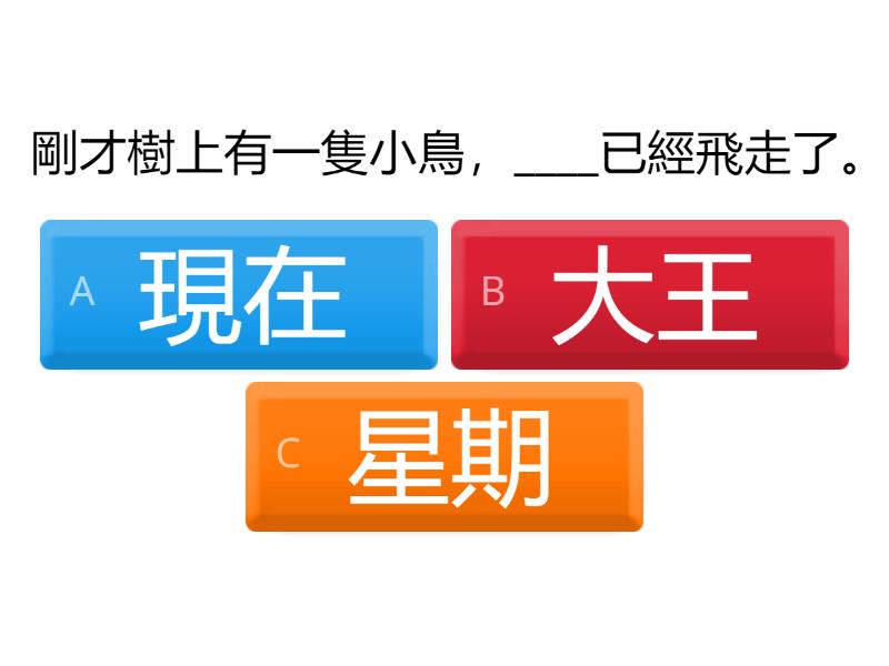 1) 剛才樹上有一隻小鳥,____已經飛走了。 a) 現在 b) 大王 c) 星期 2) 動物們聽到____的大叫,都會嚇得躲起來。 a) 星期 b) 竟然 c) 獅子 3) ____指揮軍隊保衞家園。 a) 習慣 b) 大王 c) 白天 4) 每個____六,我都會到外婆家吃晚飯。 a) 星期 b) 白天 c) 現在 5) 我____喜歡的人是爸爸和媽媽。 a) 抓 b) 夜 c) 最 6) 貓頭鷹在____休息,夜裏做事。 a) 竟然 b) 白天 c) 大王 7) 我喜歡黑____的寧靜。 a) 夜 b) 抓 c) 最 8) ____愛吃香蕉,不愛吃肉。 a) 猴子 b) 獅子 c) 竟然 9) 農夫____了一把種子撒在田裏。 a) 夜 b) 抓 c) 最 10) 年老的祖父____比我跑得快。 a) 竟然 b) 抓 c) 星期 11) 我____每天一早起來做運動。 a) 獅子 b) 最 c) 習慣