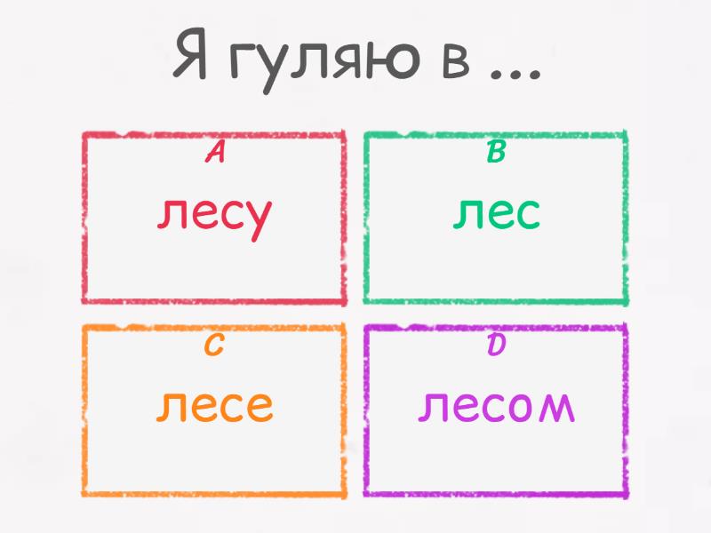 1) Я гуляю в ... a) лесу b) лес c) лесе d) лесом 2) Мне нравится отдыхать в ... a) сад b) саде c) саду d) садом 3) Я буду ждать вас в ... a) аэропорт b) аэропорту c) аэропорте d) аэропортом 4) Я видел яхты в ... a) порт b) порту c) порте d) порты 5) Ваш зонт стоит в ... a) угол b) угле c) углом d) углу 6) Сколько раз в ... вы отдыхаете? a) год b) годе c) году d) годом 7) Пальто висит в ... a) шкаф b) шкафе c) шкафу d) шкафом 8) Не гуляйте на ... a) лёд b) льде c) льдом d) льду 9) Я не учусь в ... a) школа b) школы c) школе d) школой 10) Я был в России в ... a) июнь b) июнем c) июне d) июни 11) Я читал эту книгу в ... ... a) прошлом году b) прошлом годе c) прошлым годом d) прошлому году 12) Книги стоят на ... a) полка b) полку c) полкой d) полке 13) Я говорю на ... ... a) итальянском языке b) итальянский язык c) итальянскому языку d) итальянского языка 14) Они задумались о ... ... a) русской душе b) русском душе c) русская душа d) русским душам 15) Надо думать о ... a) людях b) люди c) людьми d) людям 16) Вы говорили ... ... ? a) о мне b) об мне c) обо мне d) о меня 17) Мы говорили о ... a) лесе b) лесу c) лес d) лесом 18) Это статья о ... a) сад b) саду c) саде d) сады 19) Я помню о ... a) шкаф b) шкафе c) шкафу d) шкафом 20) Не сидите в ... a) снег b) снеге c) снегу d) снега 21) Я увидел несколько девушек на ... a) берег b) береге c) берегу d) берега 22) У нас холодно! Не сидите на ... a) пол b) полу c) поле d) полом 23) Давай встретимся на ...  a) углу b) угле c) угол d) углом