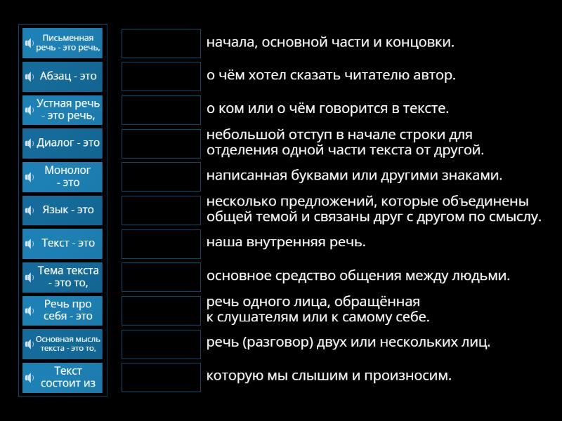 Устная речь - это речь, - которую мы слышим и произносим., Письменная речь - это речь, - написанная буквами или другими знаками., Речь про себя - это - наша внутренняя речь., Язык - это - основное средство общения между людьми., Диалог - это - речь (разговор) двух или нескольких лиц., Монолог - это - речь одного лица, обращённая к слушателям или к самому себе., Текст - это - несколько предложений, которые объединены общей темой и связаны друг с другом по смыслу., Тема текста - это то, - о ком или о чём говорится в тексте., Основная мысль текста - это то, - о чём хотел сказать читателю автор., Текст состоит из - начала, основной части и концовки., Абзац - это - небольшой отступ в начале строки для отделения одной части текста от другой.,