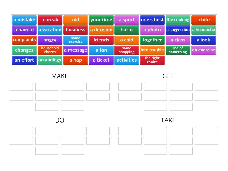 MAKE: a decision, a mistake, an effort, a suggestion, an apology, complaints, changes, friends, the right choice, use of something, GET: some exercise, a headache, a cold, a haircut, a tan, a ticket, angry, into trouble, old, together, DO: activities, business, an exercise, harm, one's best, some shopping, a sport, household chores, the cooking, TAKE: a break, a nap, a vacation, a bite, a class, a look, a message, a photo, your time,