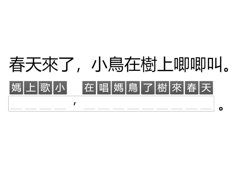 春天來了,小鳥媽媽在樹上唱歌。 - 春天來了,小鳥在樹上唧唧叫。, 星星們在天上眨眼睛。 - 星星在天上閃爍。, 花兒們在風中擺腰。 - 花兒隨風搖擺。, 雨滴們在雨傘上跳舞。 - 雨滴落在雨傘上。, 收音機哥哥每天都在大聲地說話。 - 收音機天天都在響。, 蝴蝶小姐在花叢中跳舞。 - 蝴蝶在花叢中飛。, 月亮小姐一露面,天上的星星弟弟都跑走了。 - 月亮出來了,滿天地星星都消失了。, 小魚弟弟在水裏自由自在地散步。 - 小魚在水裏地游泳。, 太陽姐姐很害羞,躲在白雲妹妹地後面,不肯見人。 - 太陽被厚厚地雲遮住了。, 小溪爸爸在唱著歡快地歌向前奔跑。 - 小溪嘩啦嘩啦地流。,