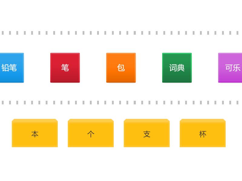 本: 书, 词典, 汉语书, 个: 包, 人, 朋友, 支: 铅笔, 笔, 毛笔, 杯: 水, 可乐, 咖啡,