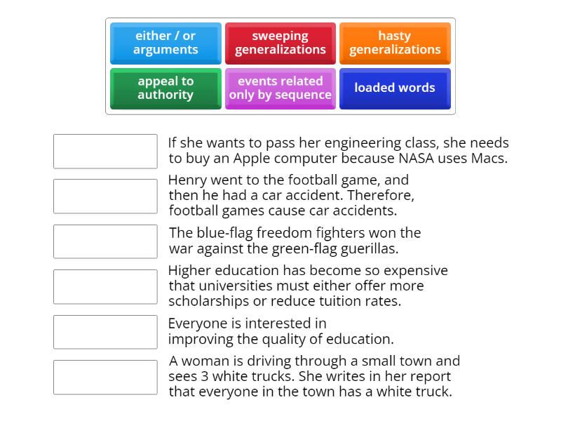 events related only by sequence - Henry went to the football game, and then he had a car accident. Therefore, football games cause car accidents., appeal to authority - If she wants to pass her engineering class, she needs to buy an Apple computer because NASA uses Macs., sweeping generalizations - Everyone is interested in improving the quality of education., hasty generalizations - A woman is driving through a small town and sees 3 white trucks. She writes in her report that everyone in the town has a white truck., loaded words - The blue-flag freedom fighters won the war against the green-flag guerillas., either / or arguments - Higher education has become so expensive that universities must either offer more scholarships or reduce tuition rates.,