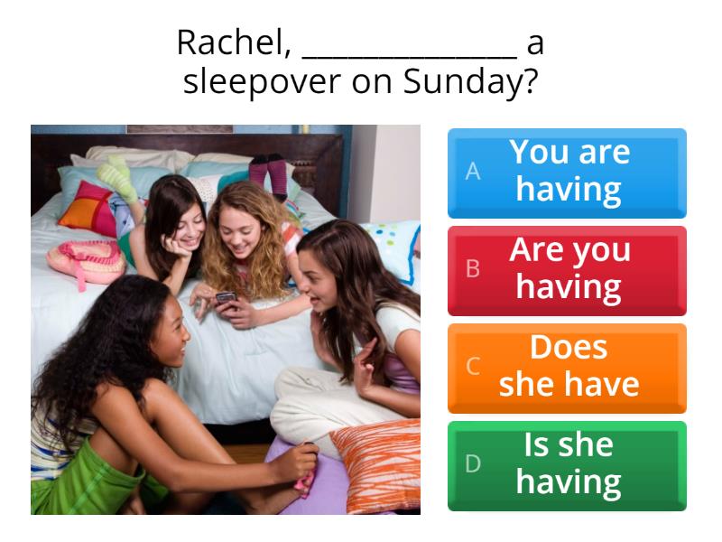 1) Rachel, ______________ a sleepover on Sunday? a) You are having b) Are you having c) Does she have d) Is she having 2) Train 626 _________ at 2:30 pm. a) leaves b) are leaving c) is leaving d) leaving 3) All my friends ____________ to my party next Thursday! a) coming b) come c) are coming d) is coming 4) My sister and I ___________ Paris next autumn. a) am visiting b) visit c) visiting d) are visiting 5) He ___________ his friends at 10 pm. a) isn’t meeting b) doesn’t meet c) not meeting d) aren’t meeting  6) We _____________ maths twice a week. a) doesn’t have b) aren’t having c) don’t have d) aren’t haveing 7) My little brother often _________ when he’s hungry. a) crying  b) is crying c) cry d) cries 8) Hanna ___________ solo around Europe in June. It’s incredible! a) is travelling b) are travelling c) travelling d) travels 9) __________ to Germany in 2023? No, he isn’t. a) Are you moving b) Is he moving c) Does he move d) Is he moveing 10) Come on! Shut up! The film ________ ! a) is starting b) starting c) start d) starts 11) Mum _________ to the supermarket this afternoon. a) goes b) is going c) go d) going 12) Well, my mother usually _____________ on Mondays. a) doesn’t work b) isn’t working c) don’t work d) doesn’t working 13) Hurry up people! We __________ in ten minutes. a) closing  b) closes c) are closing d) close