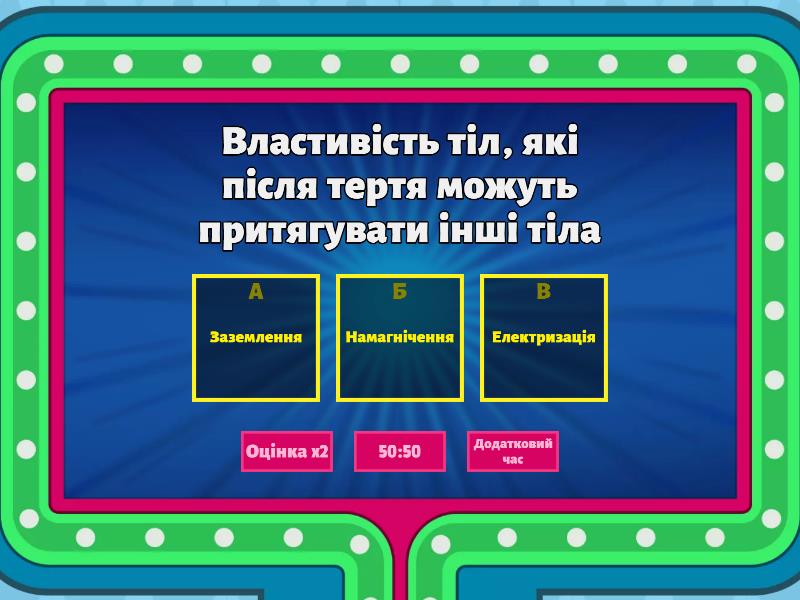 1) Властивість тіл, які після тертя можуть притягувати інші тіла a) Заземлення b) Намагнічення c) Електризація 2) Прикладом електричних явищ може бути: a) Притягнення магнітом залізних тіл b) Притягання гребінцем розчесаного волосся c) Притягання Місяця до Землі 3) Електричні заряди бувають a) Позитивними і негативними b) Тільки позитивними c) Тільки негативними 4) Заряди одного знаку a) Притягуються b) Відштовхуються c) Не взаємодіють 5) Заряди протилежних знаків a) Притягуються b) Відштовхуються c) Не взаємодіють 6) Електричний розряд в атмосфері між хмарою та землею a) Блискавка b) Веселка c) Міраж 7) Що не слід робити під час грози a) Увімкнути мобільний b) Вимкнути мобільний c) Відійти від води 8) Яка тварина може створювати електричний розряд a) b) c)