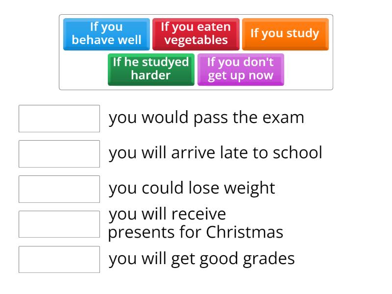 If you study  - you will get good grades , If you eaten vegetables - you could lose weight, If you don't get up now - you will arrive late to school, If he studyed harder  - you would pass the exam , If you behave well - you will receive presents for Christmas,