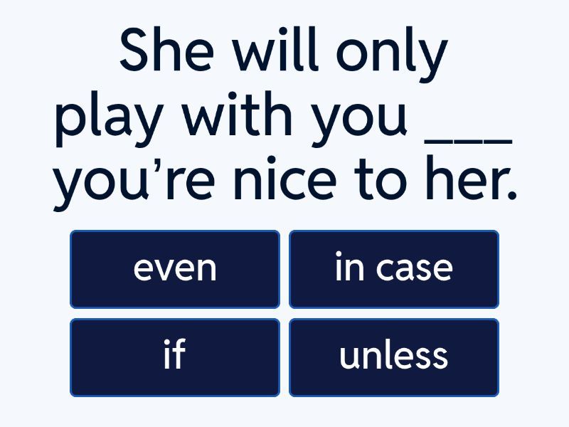 1) She will only play with you ___ you’re nice to her. a) even b) in case c) if d) unless 2) I won’t give you any money ___ you promise to spend it carefully. I don’t want you to waste it. a) even b) if c) in case d) unless 3) _______ of strong winds, the air show will be cancelled. a) Even b) If c) In case d) Unless 4) The kitchen __________ to be cleaned before I can go out. a) got b) needs c) necessary d) supposed 5) You’re not ____________ ride a motorbike if you’re not wearing a helmet. a) allowed to b) essential c) got to d) supposed 6) I ___________ to take this book back to the library, but I forgot. a) didn’t need b) necessary c) must d) was supposed 7) We ______ to take our own lunch because there wasn’t a cafeteria. a) got b) had c) must d) should 8) I _________ find out the news on the TV than the internet. a) prefer b) rather c) 'd prefer d) 'd rather 9) _______ staying in a hotel or a campsite when you’re on holiday? a) You prefer b) You rather c) Do you prefer d) Do you rather 10) I’d _________ to live in the city centre. It’s too busy for me. a) prefer not b) rather not c) not prefer d) not rather 11) I found it hard to ______ with the challenge of studying abroad. a) be b) deal c) get d) manage 12) It’s easier if you ________ the most difficult jobs out of the way first. a) get b) give c) have d) lose 13) I _________ concentration so I didn’t understand the end of the programme. a) avoided b) fell c) lost d) missed 14) I hope we can ________ the deadline. We haven’t got much time. a) do b) get c) know d) meet 15) My office is very busy so it’s difficult to ________ distractions. a) avoid b) keep c) lose d) miss 16) I was given a __________ contract so I’ll be able to work there for a long time. a) background b) chance c) permanent d) temporary 17) Sarah’s _________ of the agenda for today’s meeting. a) dealing b) in charge c) managing d) responsible 18) I left my last job because the employer was ___________ the staff unfairly. a) dealing b) exploiting c) taking d) treating 19) You need to take ________ for your actions. You can’t blame anyone else. a) background b) experience c) opportunity d) responsibility 20) I’ve got a permanent contract now, but I’d always had ___________ ones before this. a) short-term b) long-term c) planned d) arranged 21) You can wear _________ clothes to the wedding. You don’t need to wear a suit. a) inappropriate b) informal c) independent d) insensitive 22) The manager’s decision was ___ with the staff. No one liked it. a) uncertain b) unclear c) unhealthy d) unpopular 23) ________ me a bit about your current job. a) Tell b) Let c) Say d) Explain 24) _________ what criticisms they might have? a) Do you ask b) Are you asking c) You ask d) You are asking 25) __________ is that I’m sensitive to the needs of others. a) I have a lot to offer b) My colleagues would say c) One of my main strengths d) It’s important for me