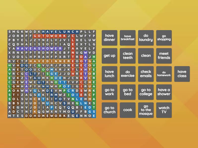 goshopping - go shopping, haveashower - have a shower, cleanteeth - clean teeth, getup - get up, gotobed - go to bed, dolaundry - do laundry, cook - cook, havebreakfast - have breakfast, clean - clean, gotowork - go to work, gotocollege - go to college, dohomework - do homework, havelunch - have lunch, havedinner - have dinner, haveclass - have class, watchtv - watch TV, doexercise - do exercise, meetfriends - meet friends, checkemails - check emails, gotothemosque - go to the mosque, gotochurch - go to church,